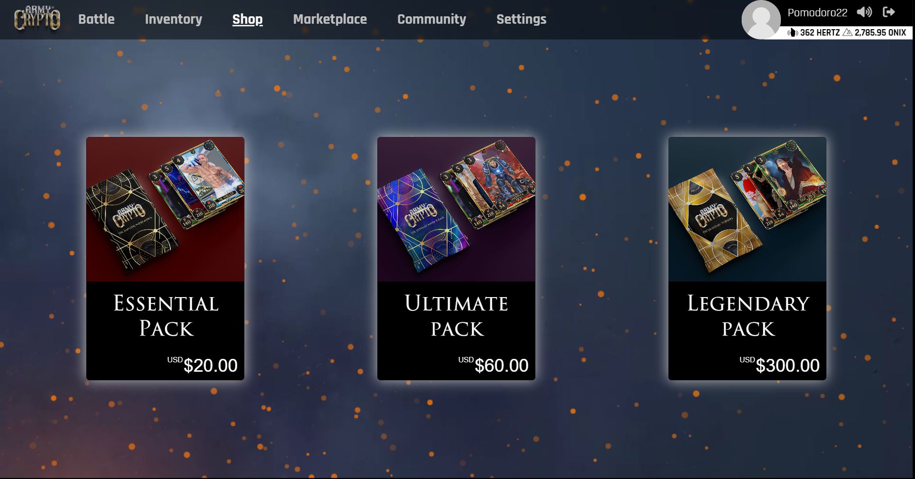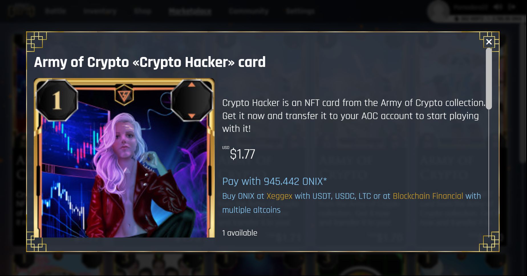 We integrated the Onix marketplace in our game, so users can see the cards put for sale there. We also provided a link to the website, so cards can be purchased and moved into your inventory from the Onix website.
