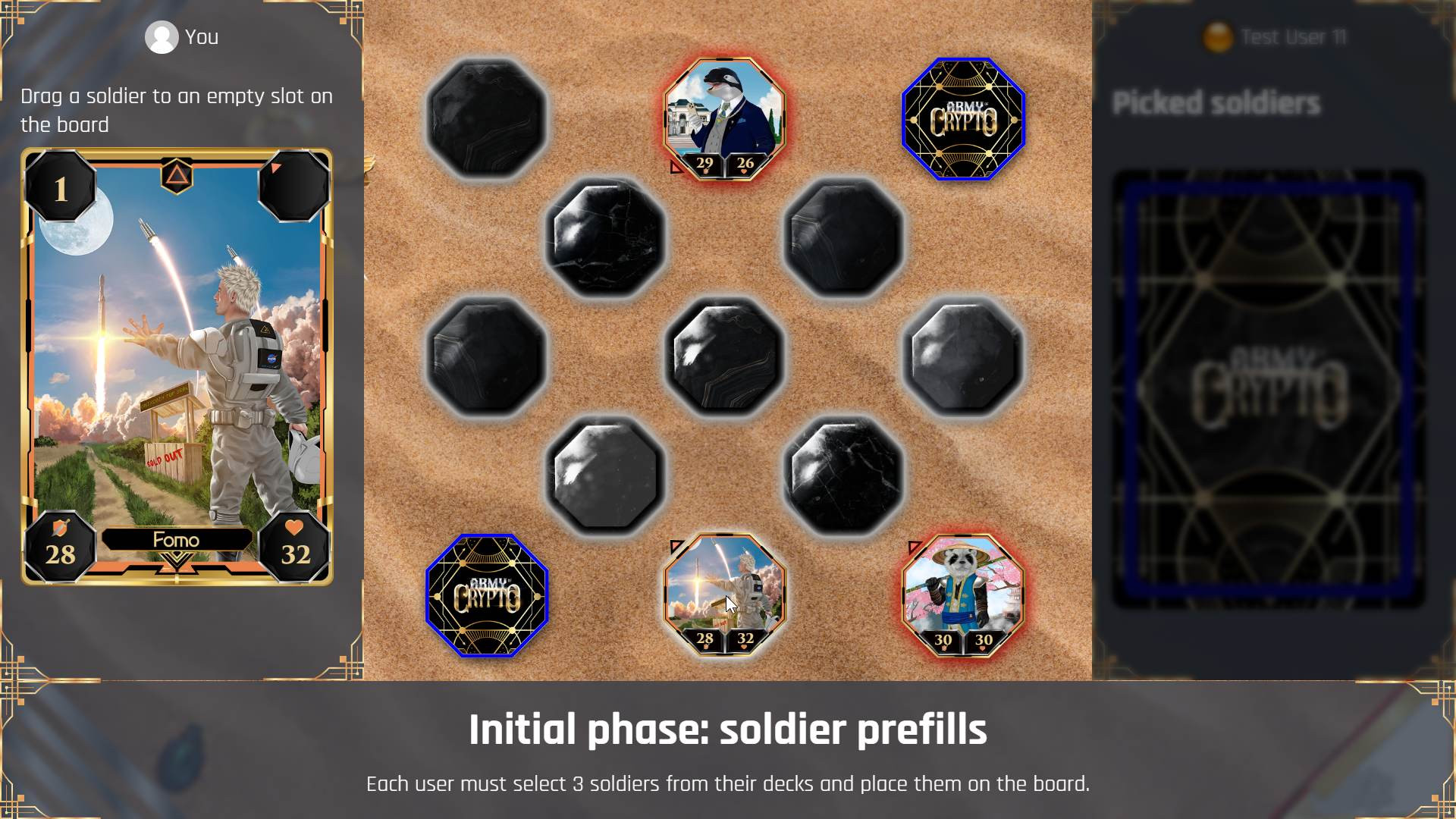 What you see there is the initial phase of a match, where both players pick 3 soldiers and place them on the board. After this phase, the actual battle begins, but we're not there yet.